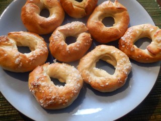 This recipe is a basic yeast dough — flour, water, salt. You’re kneading it; letting it go through a standard first rise (about an hour, until about doubled); cutting and shaping the dough (either pretzels or bagels); boiling it very briefly and draining it; baking in a hot oven; letting cool a bit before eating.
