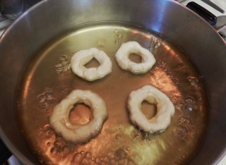 Boiling the bagels, in 4 cups of water, with 1 1/2 Tablespoons of golden syrup added. The pretzels were boiled in 4 cups of water with 4 Tablespoons of baking soda added. [Photo, TW Carns]