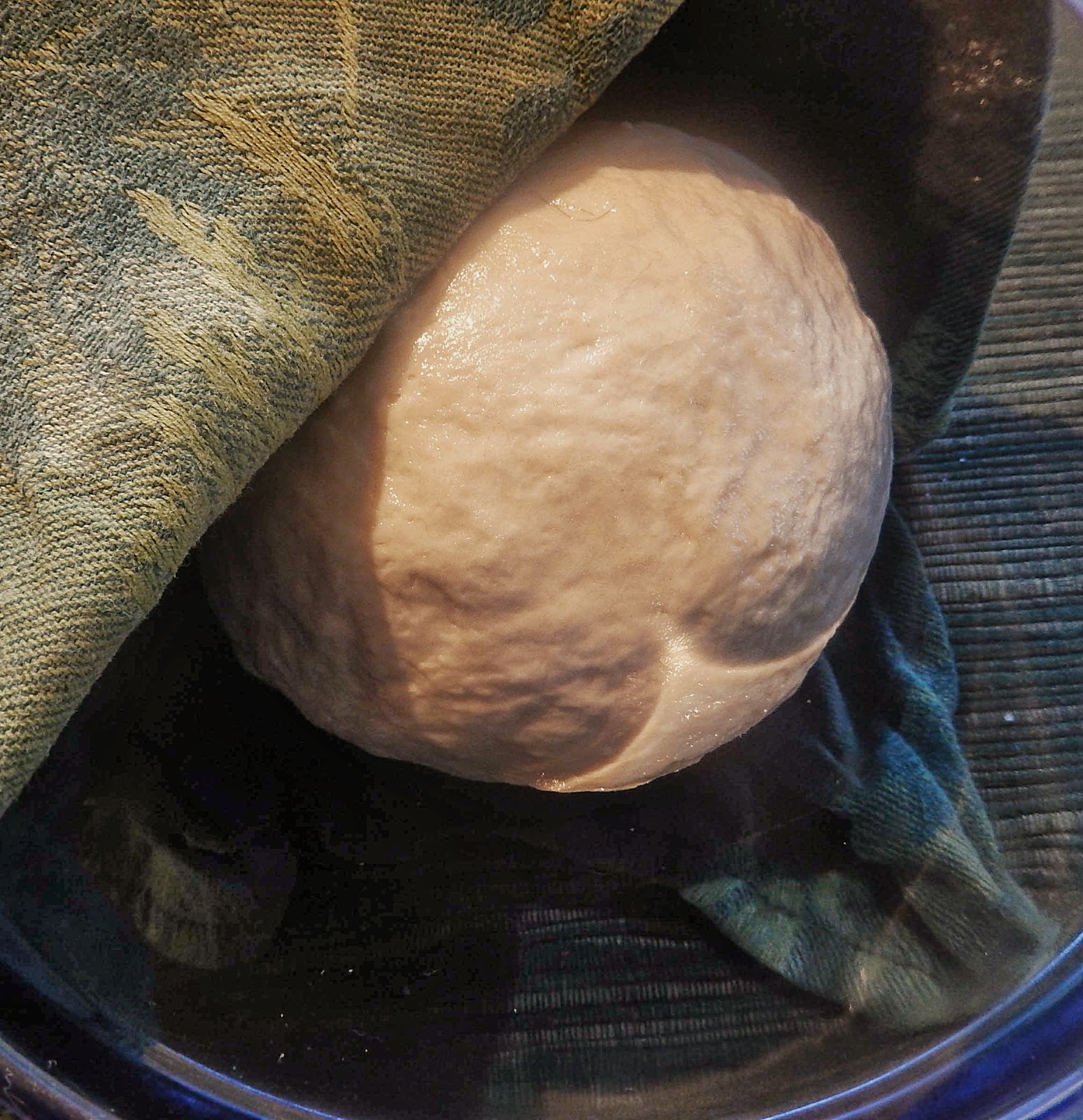 Dough in bowl, ready to rise. Cover with a damp towel or lightly layer plastic wrap over it, to keep it from drying out. [Photo, TW Carns]