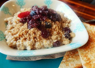 Jim’s oatmeal, with choices of fresh fruit, dried cranberries, brown sugar, cream, honey, and more for toppings. All of La Baleine’s dishes are unusual pottery, suitable for setting off the food.