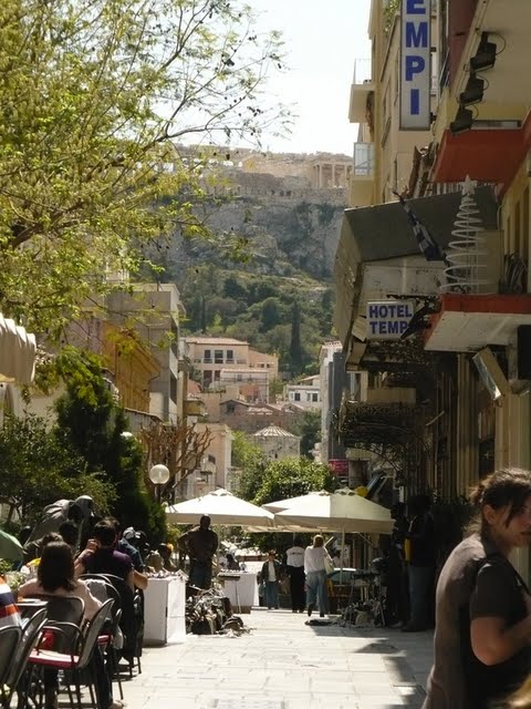 Street in the Plaka, the old section of Athens, with the Parthenon at top of picture [TWCarns]