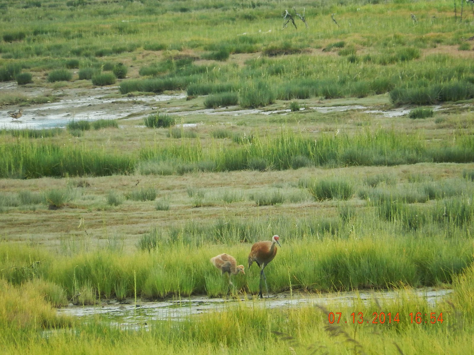 Sandhill crane and half-grown chick at Beluga Slough (there were two adults and two young ones, but couldn’t get them all in the same picture) [Photo, TWCarns]