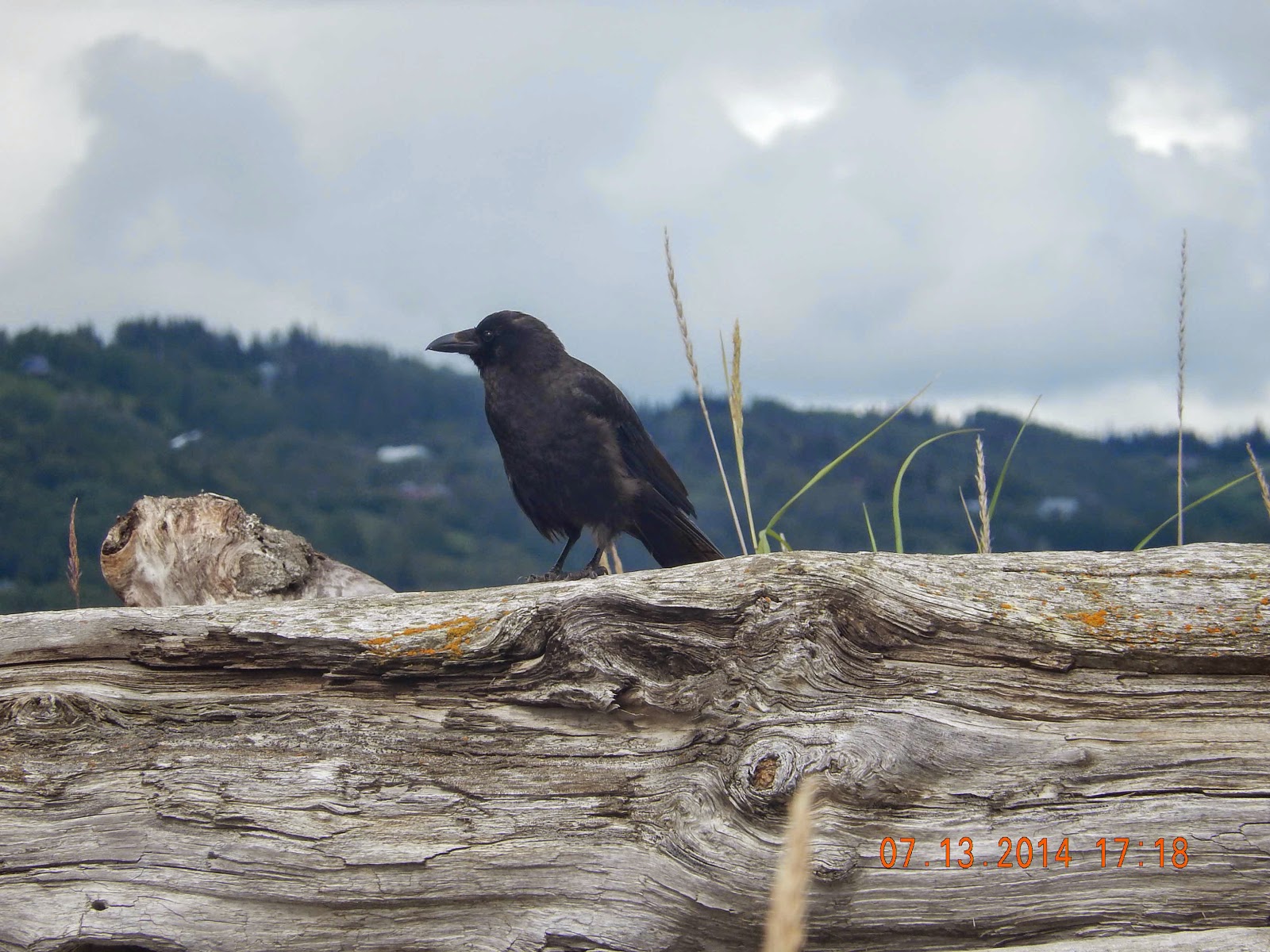 Raven on driftwood at Bishop’s Beach [Photo, TWCarns]